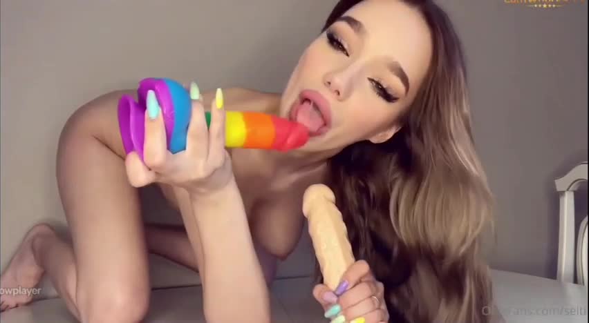 Малышка из OnlyFans пробует в деле обычный и радужный дилдо. Она присосала оба их к поверхности стола и попробовала присесть и взять в ротик.