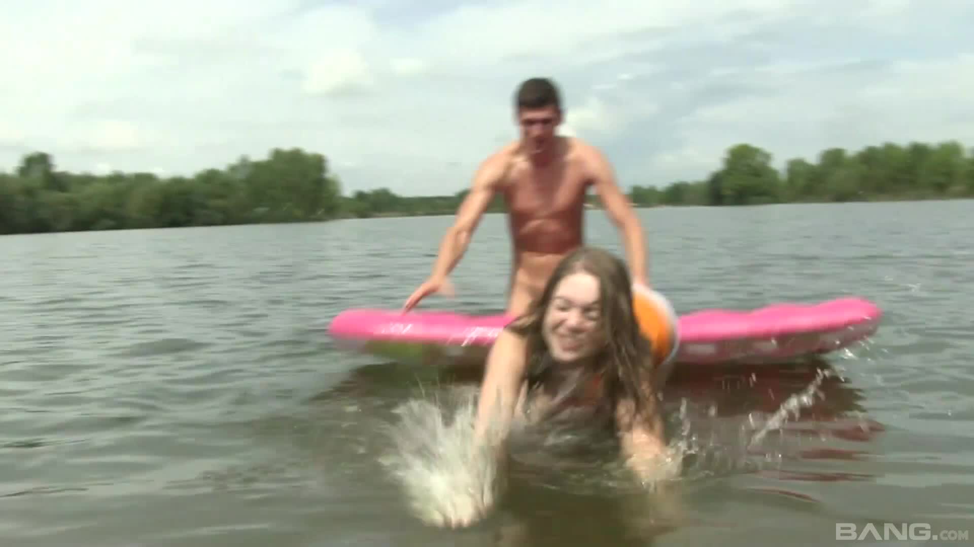 Молодая милая девушка пришла с другом на реку покупаться. Они взяли с собой надувной матрас. Друг был возбужден и начал потихоньку домогаться до девушки. И та, похоже, была не против. Немного поломавшись, она потрахалась с ним.