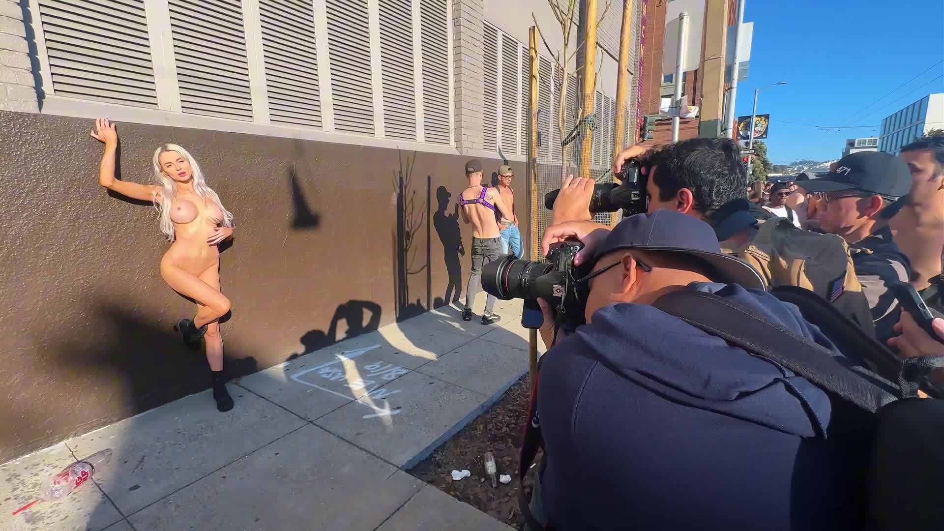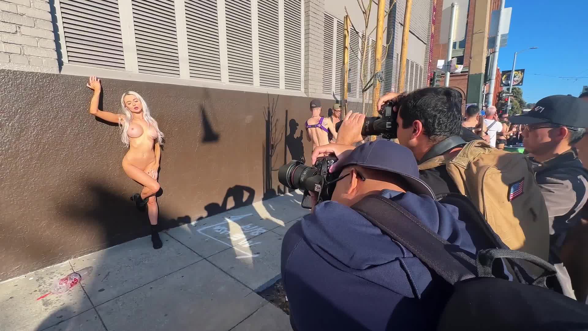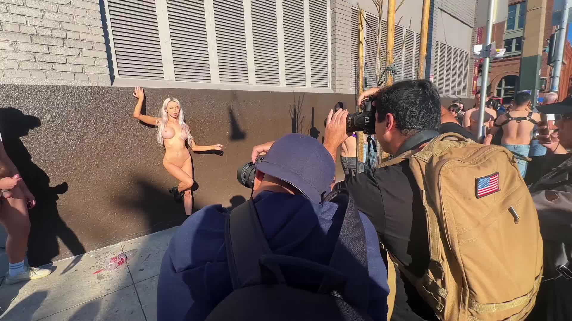 На гей параде на улице в Европе откуда-то взялась эффектная голая телочка и собрала всех фотографов вокруг себя.