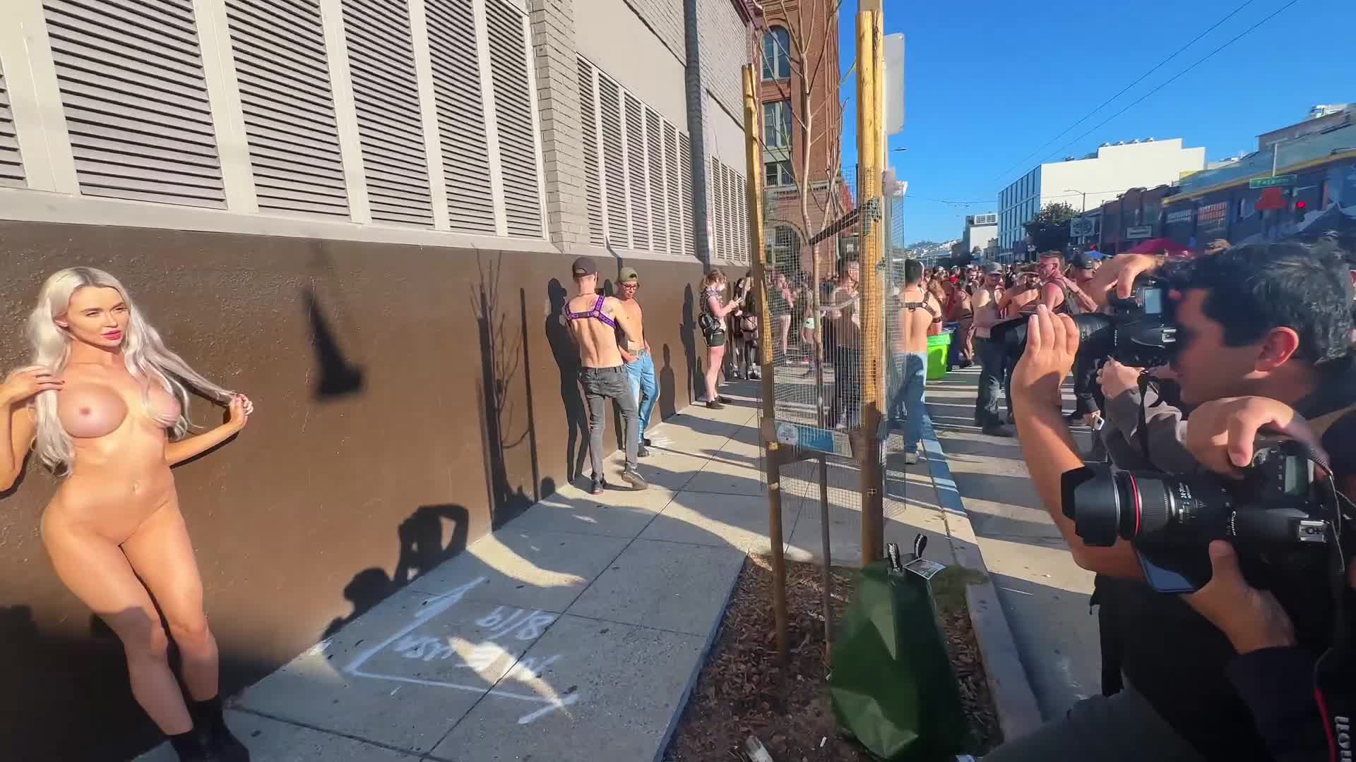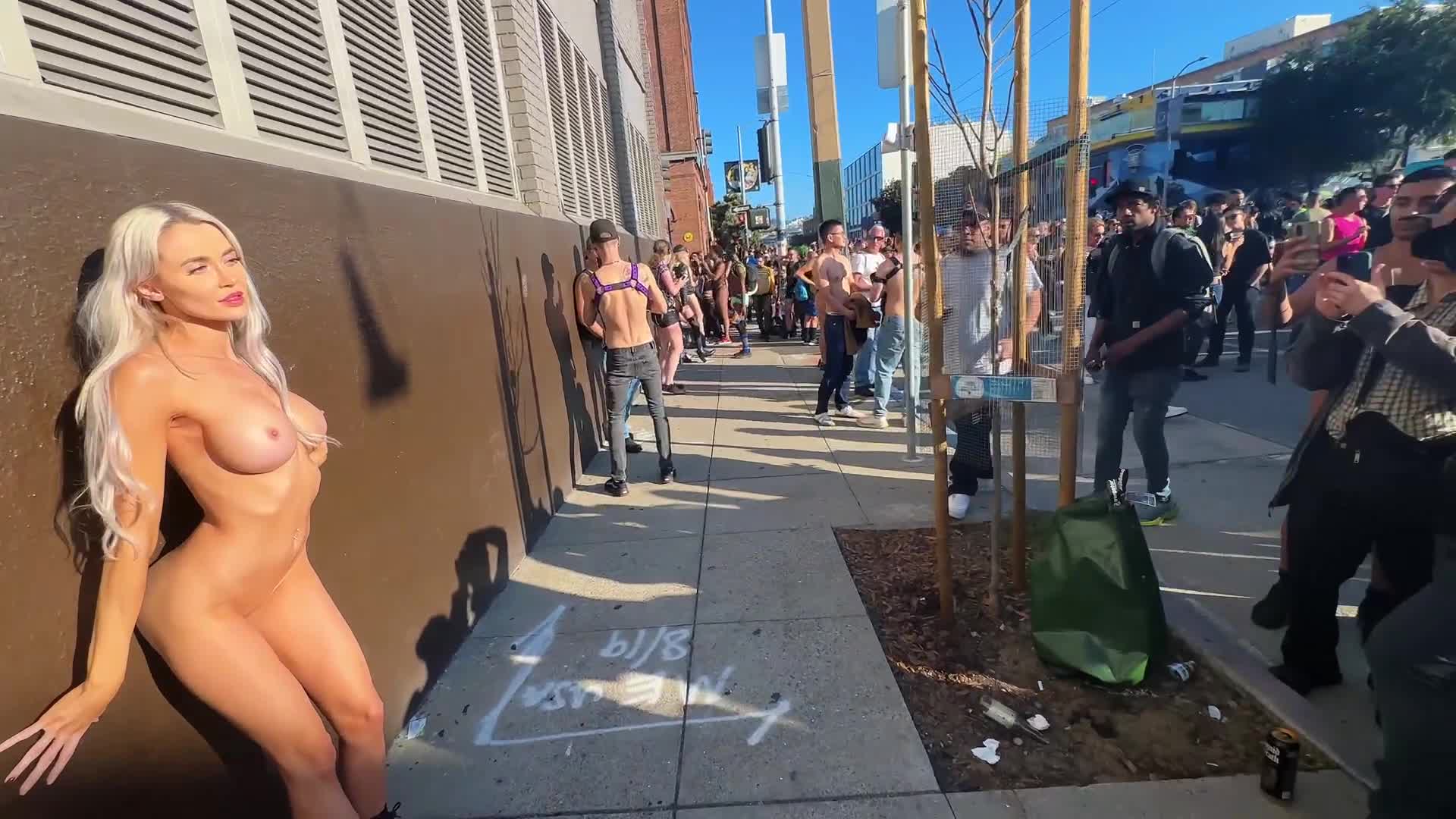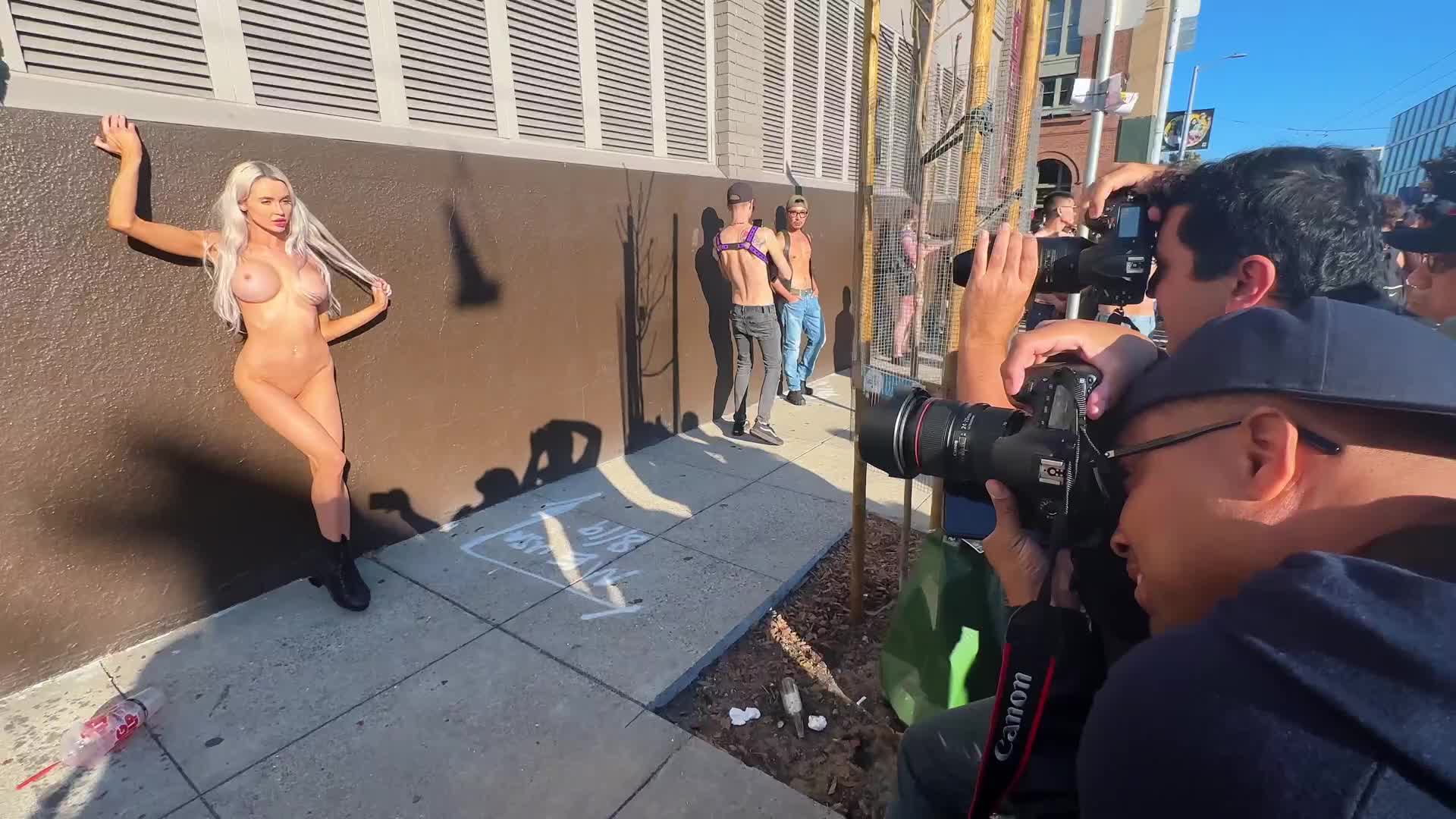 На гей параде на улице в Европе откуда-то взялась эффектная голая телочка и собрала всех фотографов вокруг себя.