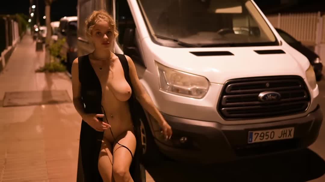 Девушка избавилась от всей своей одежды и разгуливает голая по ночному городу.