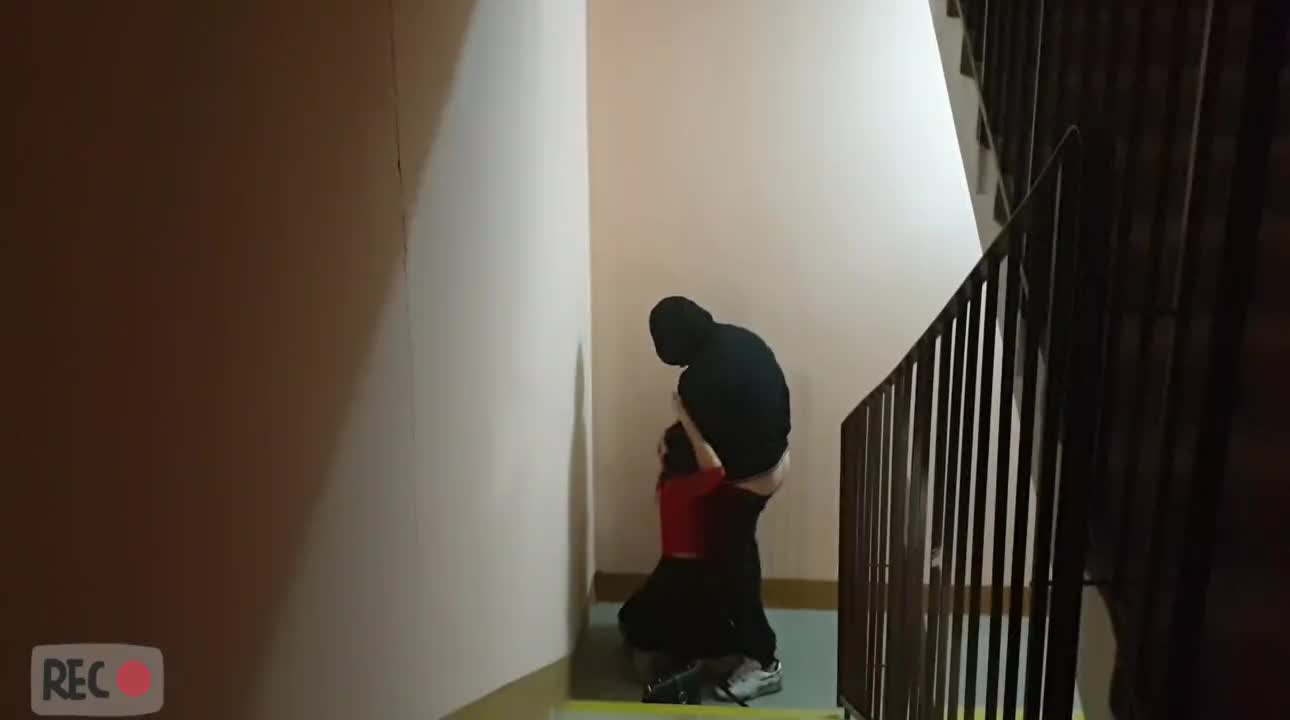 Девушка в юбке подымалась по лестничному маршу подъезда. В это время сзади подбежал парень в капюшоне, заломал ее и начал давать в рот. А после изнасиловал раком.