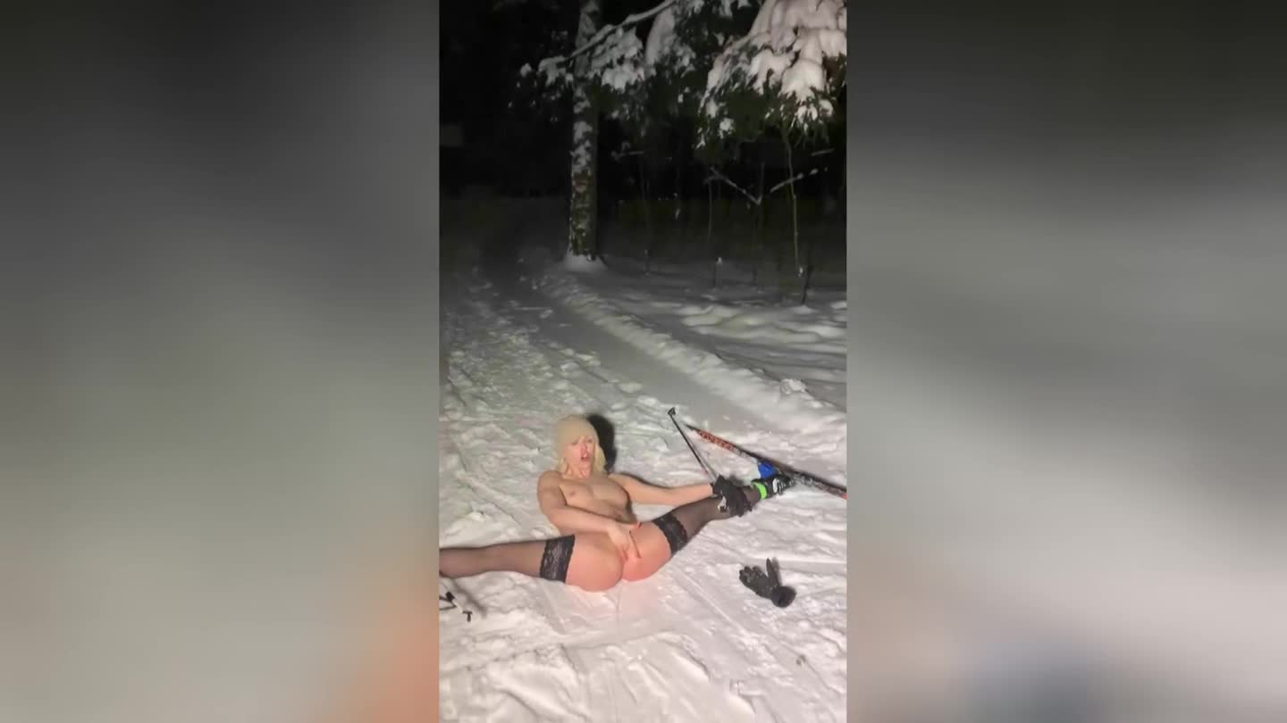 Лыжница немного не дотянула до финиша, развалилась на снегу, широко раздвинула ноги и принялась мастурбировать.