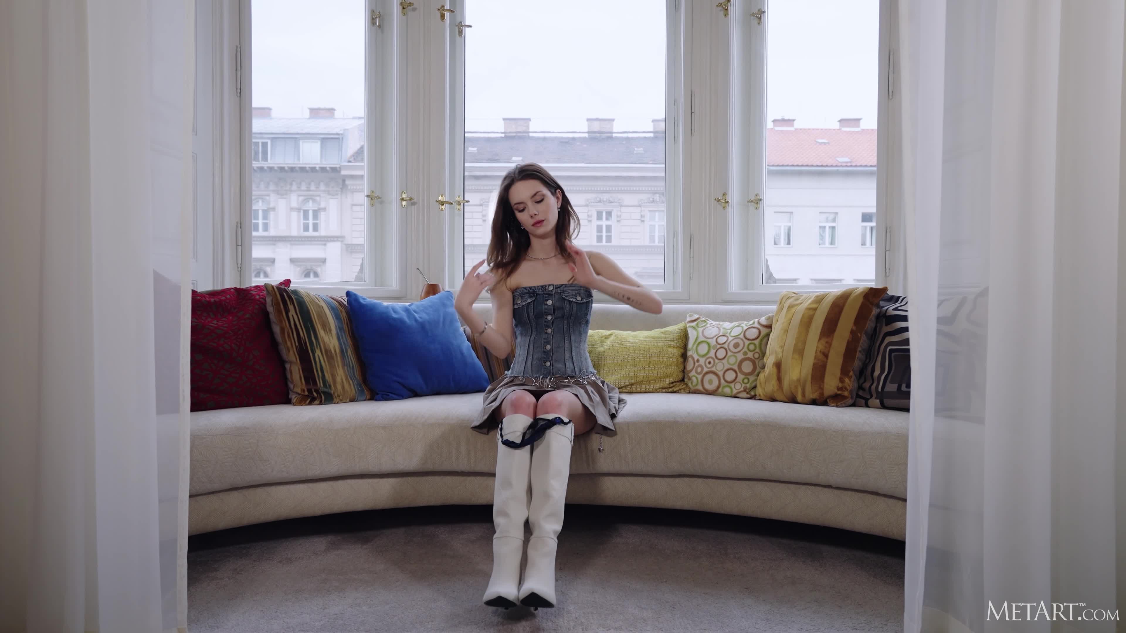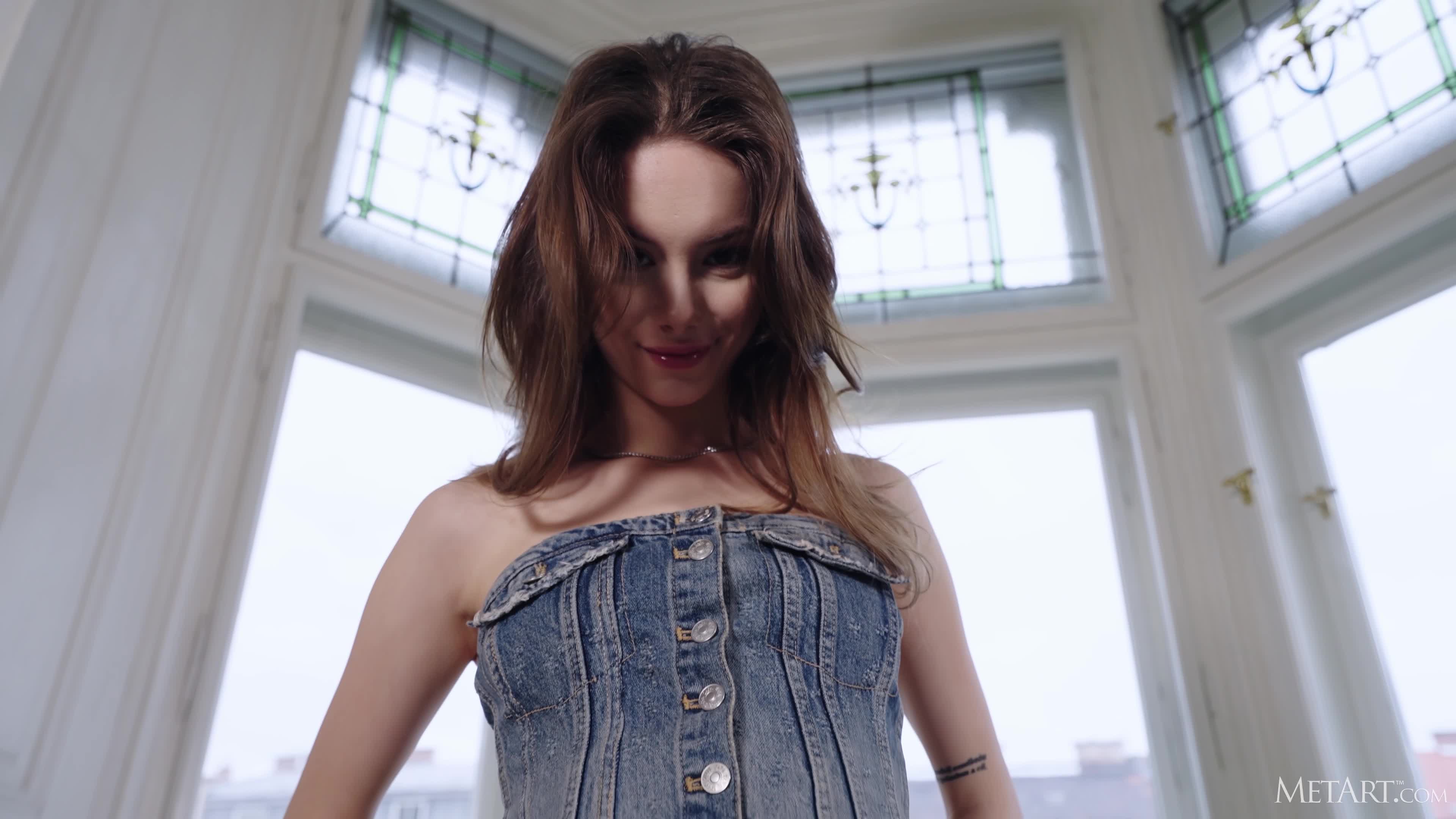 Девушка неспеша и эротично раздевается у большого незашторенного окна, оставаясь полностью голой. Раздражение в области промежности только подчеркивает ее естественность.