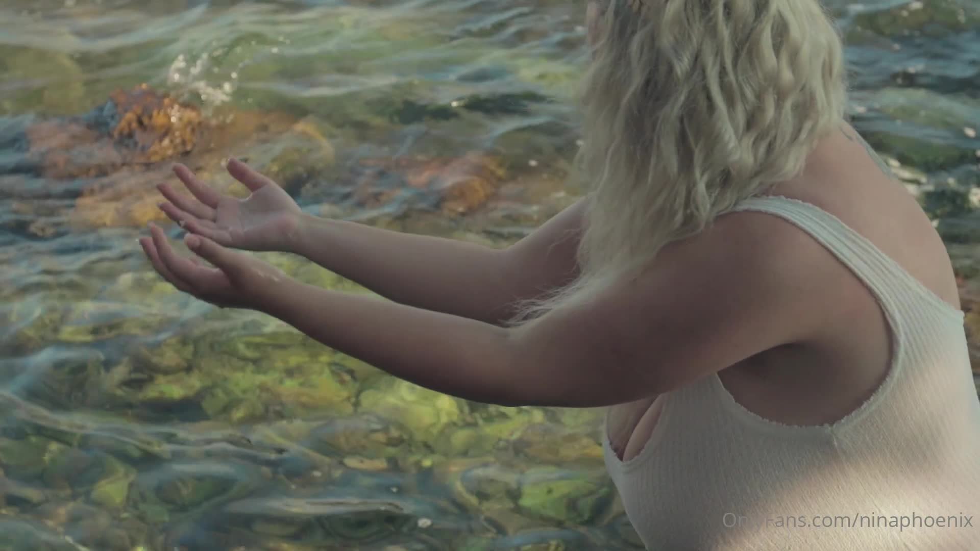 Девушка с огромными сиськами позирует на берегу моря.