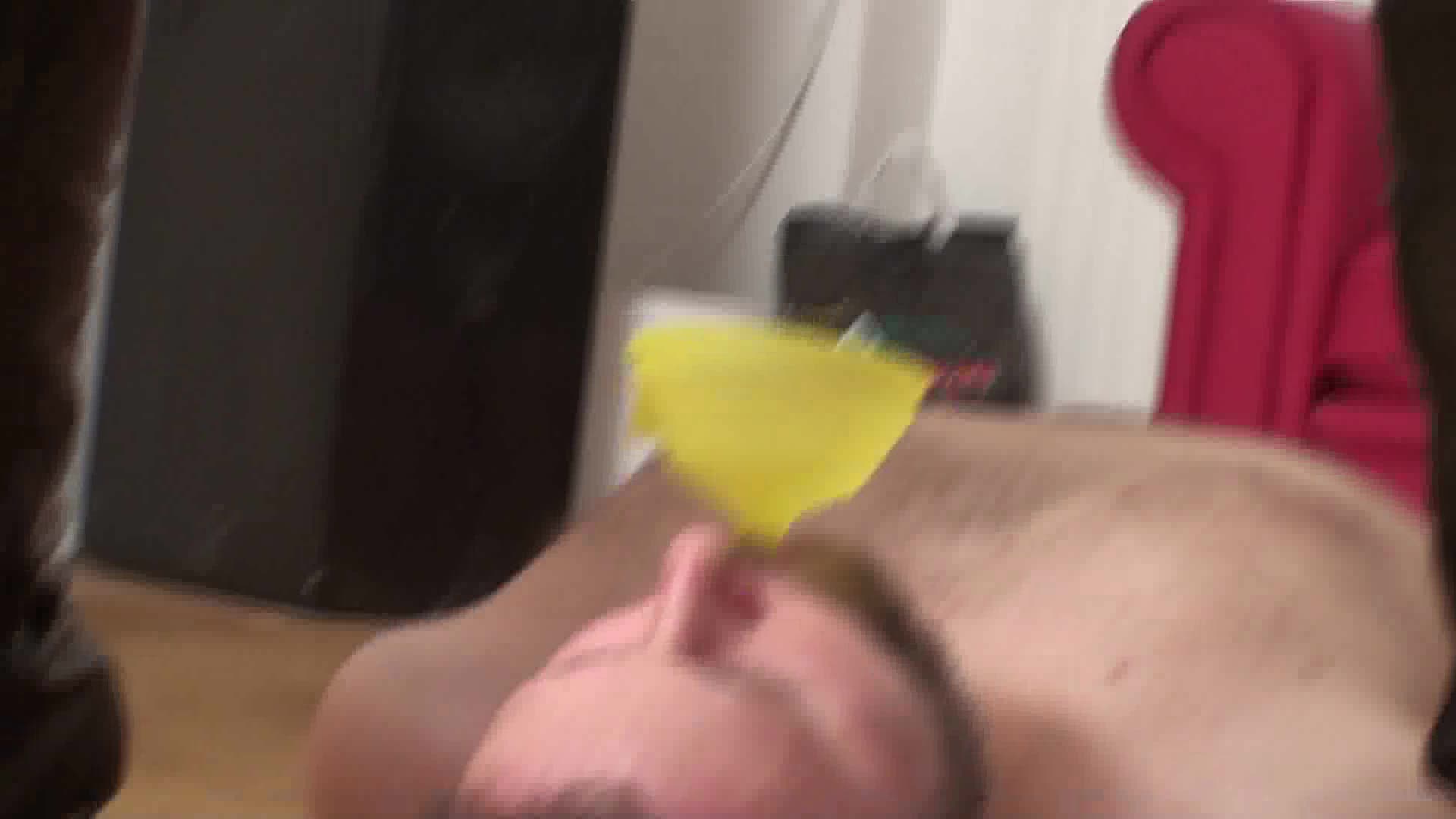 Мужик лег на спину и зажал во рту желтую воронку. Сверху над ним встала женщина, которая стала целиться пиздой, чтобы попасть в воронку струей своей мочи.