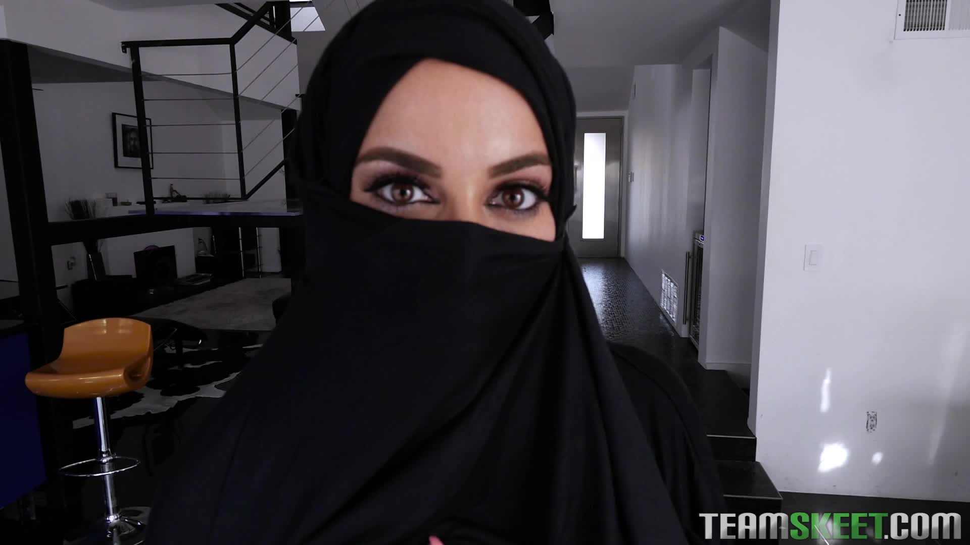 Девушка закосплеила мусульманку в хиджабе и засветила свое черное нижнее белье и большие сиськи. А после этого она отсосала мужику и села сверху на его член.
