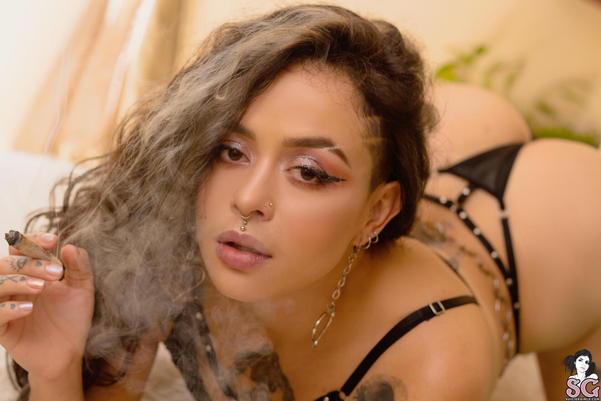 Девушка курит косяк и раздевается